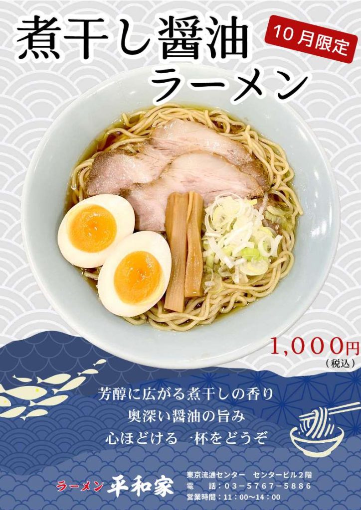 平和家 ラーメン平和家 10月限定商品🍜 2025.10.09 平和家の今月の月替わり限定商品のお知らせです。煮干し醤油ラーメン 1,000円(税込)提供スタートしております!優しく奥深い煮干しの風味で味わう、スッキリとした醤油ラーメンです🐟いつもは定番の家系派という方も、この機会にいかがでしょうか?是非ご賞味ください🍜 ◀︎ 前へ 一覧 次へ ▶︎