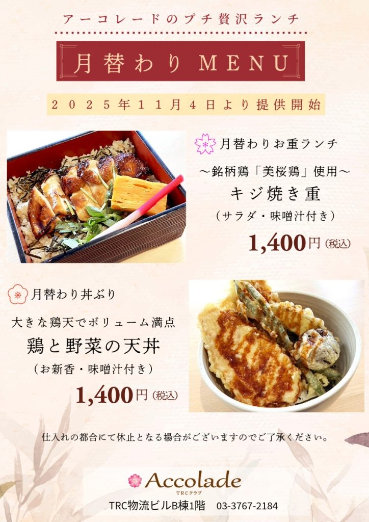 アーコレードより、毎月変わる「お重」「どんぶり」メニューのご案内です。