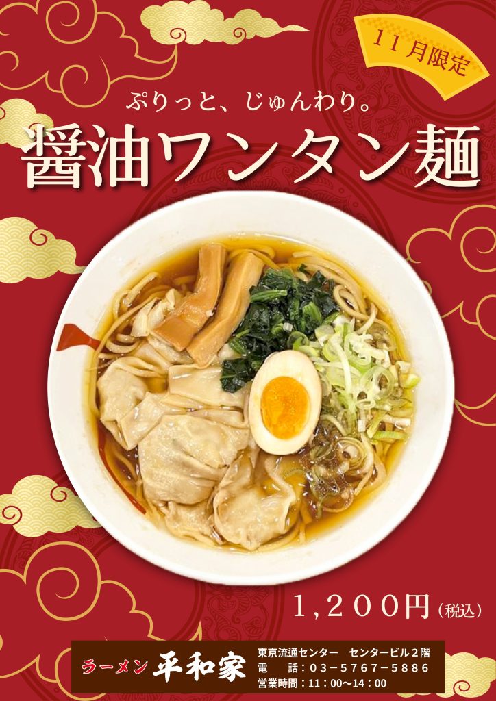 平和家 【11月限定】醤油ワンタン麺 販売開始🍜 2025.11.06 平和家の月替わりラーメンのお知らせです。11月は「醤油ワンタン麺」が登場します🍜ぷりっとした食べ心地、じゅわ~っとスープの旨みが染みたワンタンは、寒くなってきた今のシーズンにもピッタリですよね💭是非ご賞味ください! ◀︎ 前へ 一覧 次へ ▶︎