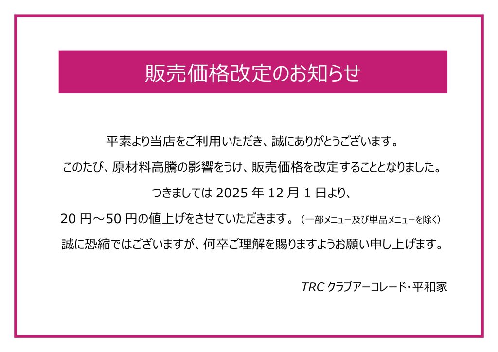 平和家Accolade 販売価格改定のお知らせ(アーコレード・平和家) 2025.11.26 いつもTRCクラブ アーコレード、平和家をご愛顧いただき誠にありがとうございます。誠に不本意ながら下記のとおり、販売価格改定の実施について、何卒ご理解ご協力をいただきたくお願い申し上げます。 ◀︎ 前へ 一覧 次へ ▶︎
