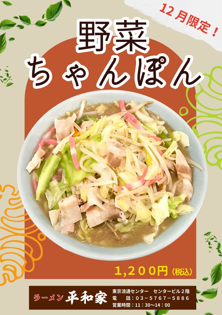 平和家 【12月限定商品】野菜ちゃんぽん🍜 2025.11.27 平和家より、月替わり限定商品のご案内です。12月は野菜がたっぷり乗ったちゃんぽん麺になります🍜満足度抜群の1杯です!是非ご賞味ください✨ ◀︎ 前へ 一覧