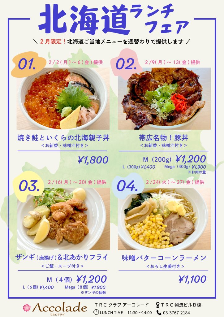 Accolade 【初開催】北海道ランチフェア🍴✨ 2026.01.27 初開催となるご当地系ランチフェアが決定しました!2月中、週替わりで北海道のご当地グルメが登場します😊是非ご利用いただき、スタッフまで感想をお伝えいただけますと幸いです🎶次回以降の参考とさせていただきます。ご利用お待ちしております! ◀︎ 前へ 一覧 次へ ▶︎
