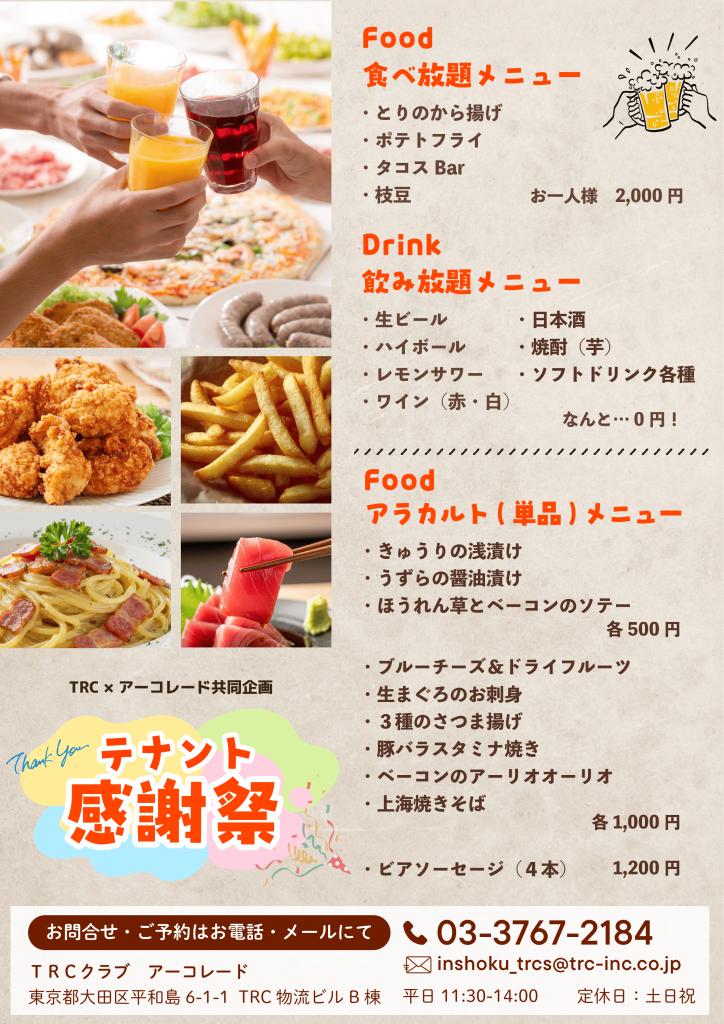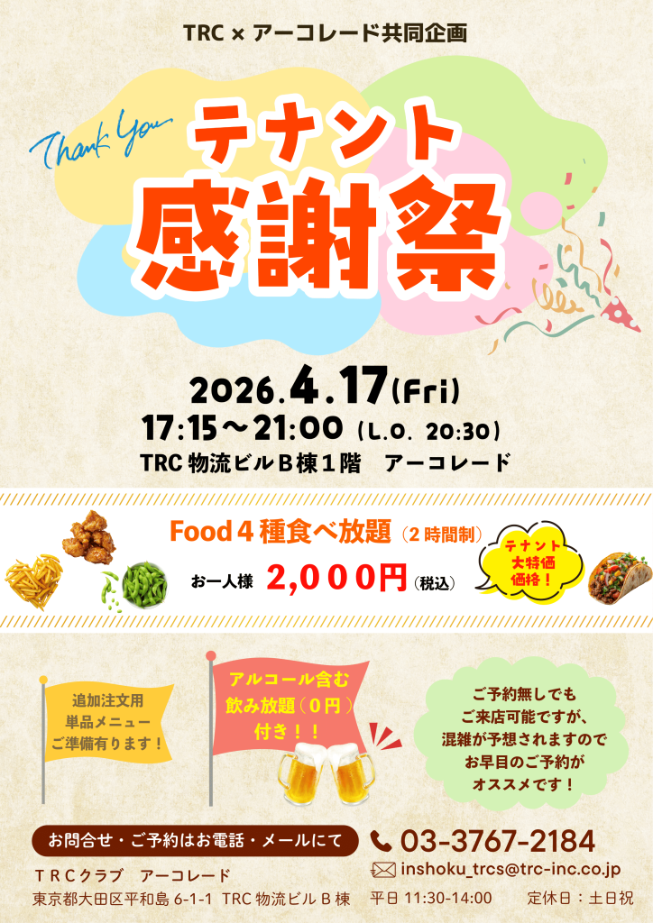 Accolade 🍻アーコレード×TRC共同企画【テナント感謝祭】🌟 2026.04.13 昨年10月にも実施を致しました、TRCとの共同企画「テナント感謝祭」がなんと2度目の開催が決定致しました😲✨おつまみフード4種類食べ放題2,000円に飲み放題0円(!)付きのテナント大特価🎶前回ご好評をいただいた、追加オーダー用のメニューもご準備しております!ご予約無しでもご利用可能ですが、混雑が予想されますので事前のご予約がオススメです🐱皆様お誘い合わせのうえ、是非ご利用ください! ◀︎ 前へ 一覧 次へ ▶︎