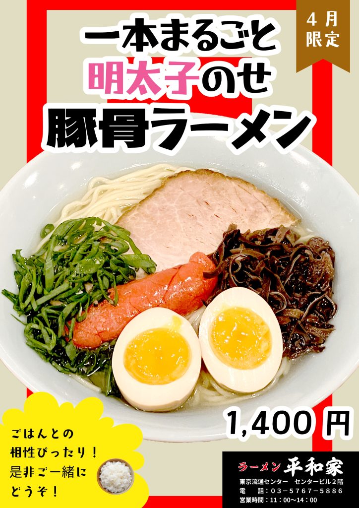 平和家 4月の月替わりラーメン🍜 2026.04.13 平和家より4月の月替わりラーメンのご案内です🍜今月は丸ごと1本明太子がのった豚骨ラーメン!オススメはサイドメニューのご飯🍚明太子と頂くほか、残ったスープに明太子を崩しておじや風でシメても最高です◎ピンクに染まるスープも春らしいですよね🌸是非ご賞味ください! ◀︎ 前へ 一覧